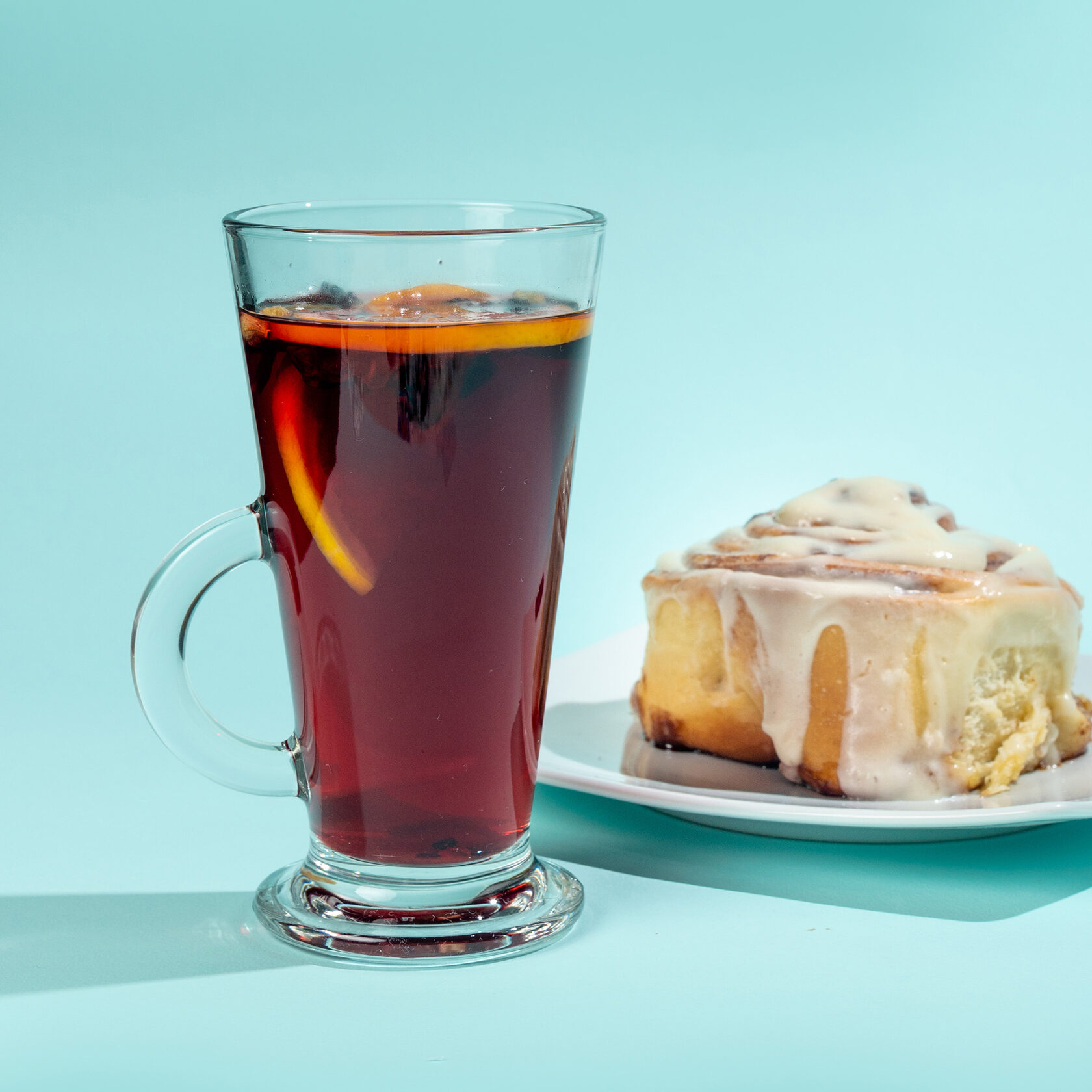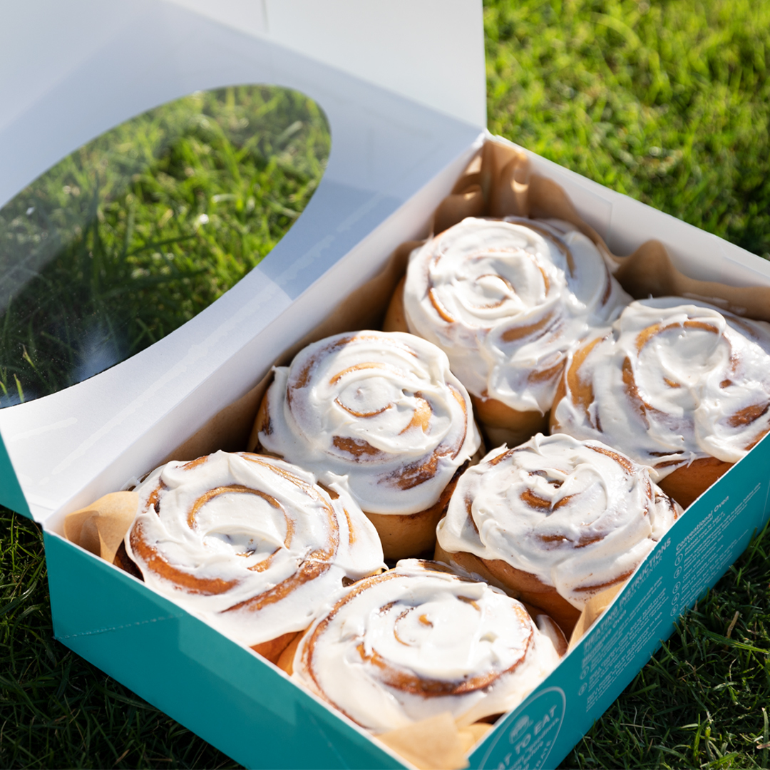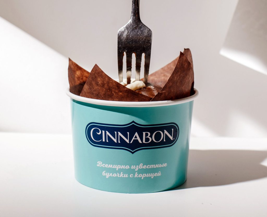 Кусочки фирменного ролла с корицей, покрытые сырно-сливочной глазурью в индивидуальном фирменном стаканчике.