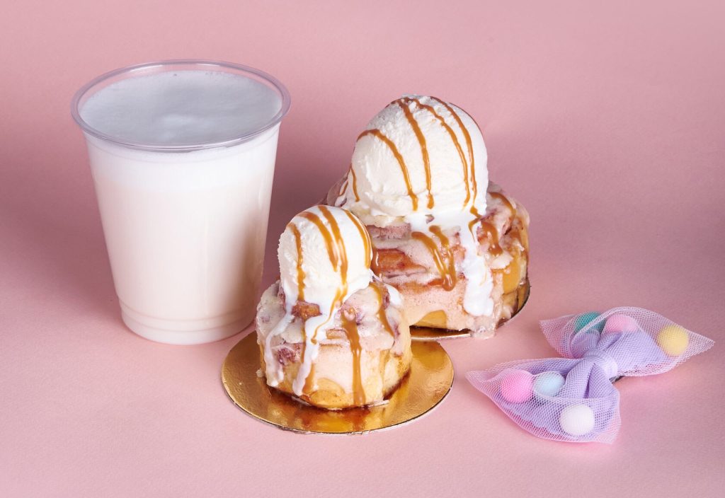 Это мини ролл, в начинку которого входит ароматная корица Макара® высшего качества. Булочка пропитывается глазурью, изготовленной на основе сливочного сыра. Сверху украшается шариком освежающего мороженого политого карамелью.